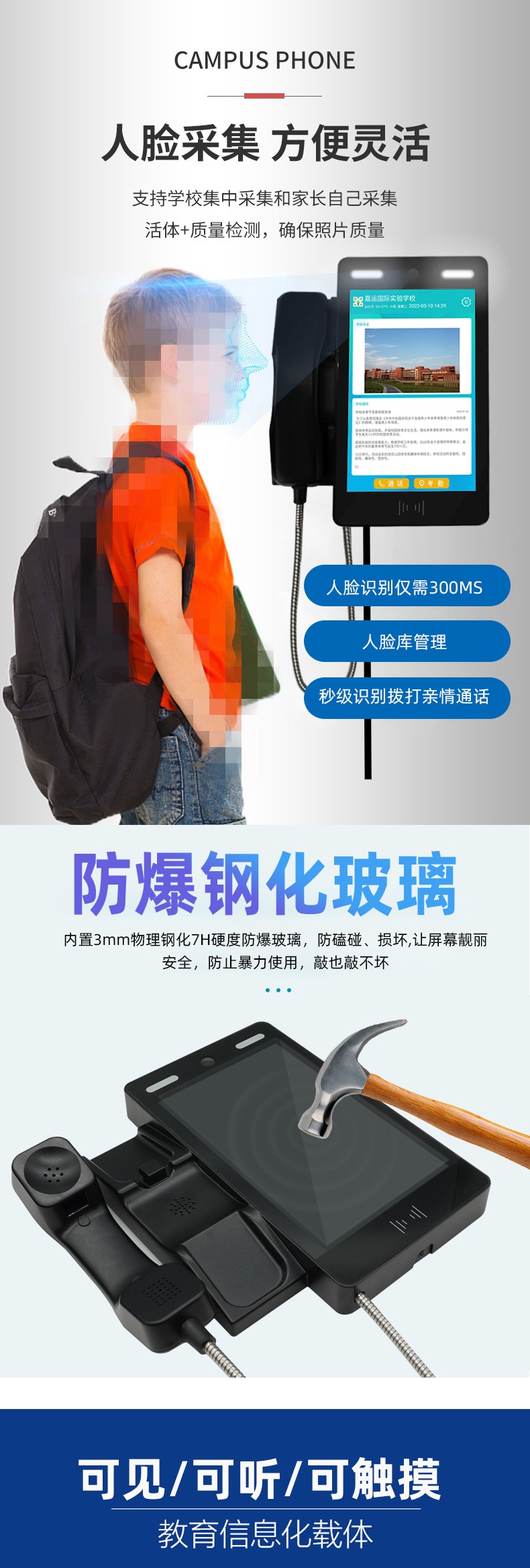 人臉識別可視話機產品穩定,使用方便??梢酝ㄟ^人臉識別,撥打親子電話,學生可以選擇語音或視頻。