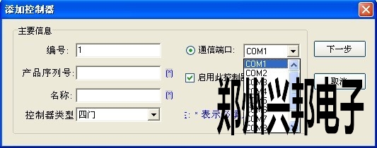 首先選擇好電腦的通訊端口,填寫產品的序列號一般出廠默認設置是0000,然后為設備起個名稱,選擇好所控制門的類型,最后點擊下一步,接著會彈出如圖七所示對話框。