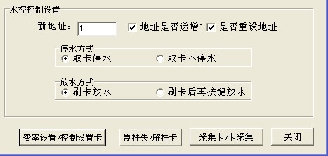 2   水控控制設置:新地址設置為1,把地址號是否遞增和是否重設機器號前面的選項選上,如下圖所示,點擊費率設置|控制設置卡按鈕,點擊控制設置卡, 即可成功制作成控制設置卡去修改聯網型水控一體機的機器號??刂圃O置卡在機器上數卡成功時會提示8 OK  9 OK  10 OK