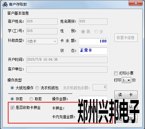 使用方法:首先要在制卡參數組中設置要收取的卡押金的金額,以元為單位,例如設置為20元。然后打卡存取款的界面,將需要充值的卡放到讀卡器上,點擊讀卡,會顯示出這張卡的信息,在操作金額一欄輸入要操作的金額,然后勾選是否收取卡押金,勾選后會自動顯示出卡內實際的充值金額,是操作金額減去押金后剩余的金額,然后點擊確認即可。